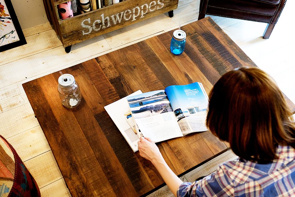 古材仕上げのテーブルは、あなたを旅先へ運ぶイカダのようです。