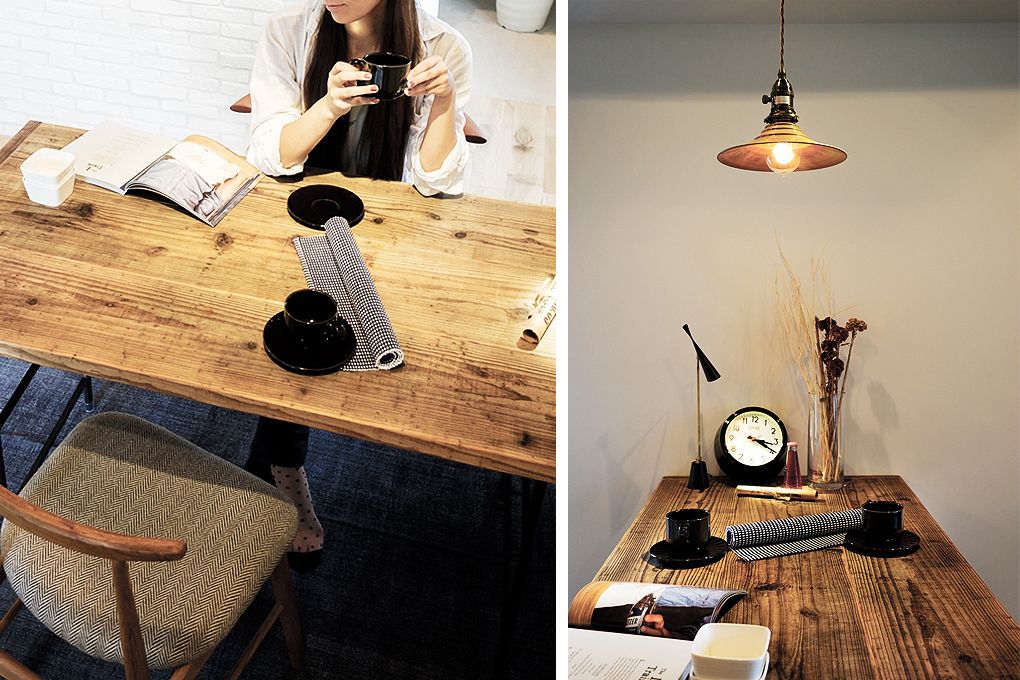 古材を使用したダイニングテーブルはお部屋の中のマットなアクセント。