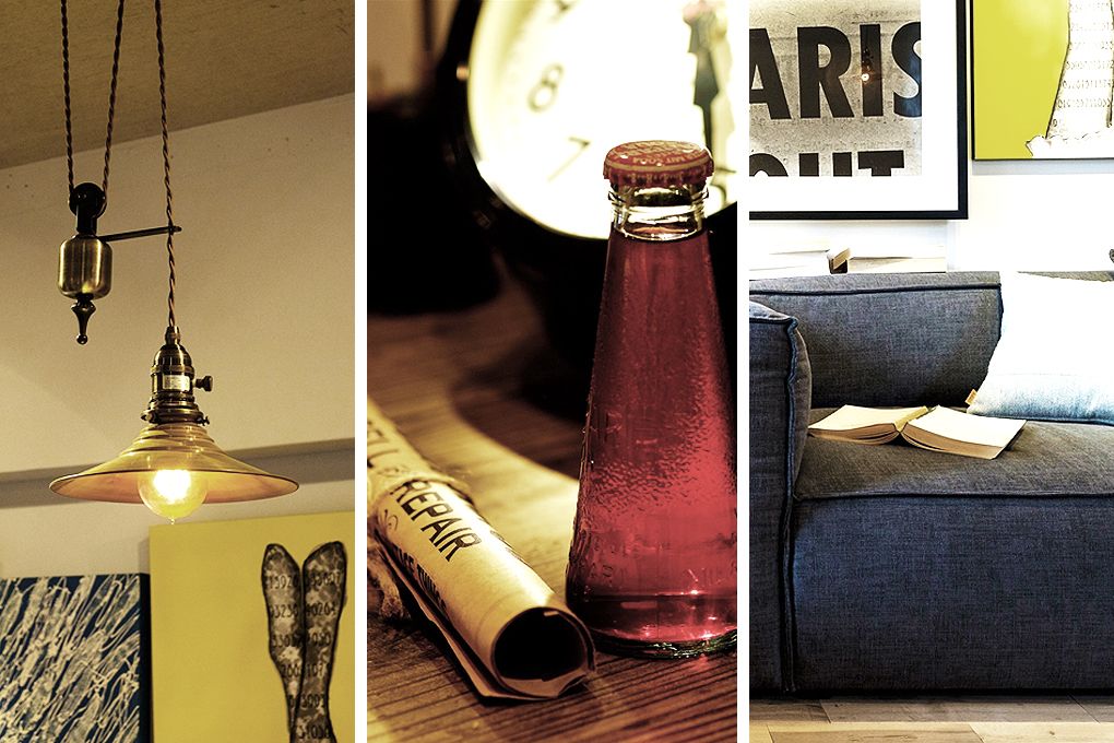 レイアウトだって遊んじゃえ。ボリューミーなソファと、古材を使用したインダストリアルがいい具合に”ラフさ”を演出。そして、アートフレームや照明器具などのガラスや真鍮素材は、光を使ったアクセントになります。