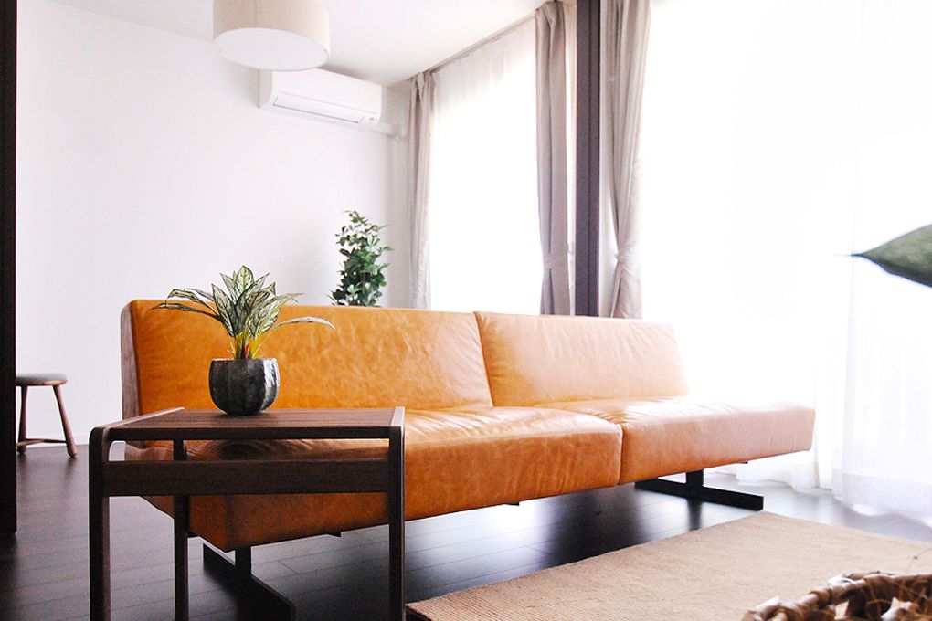 ダークブラウンと白を基調とした落ち着いた空間に、蜜柑色のソファ。