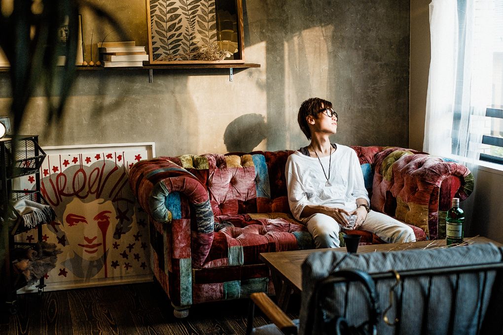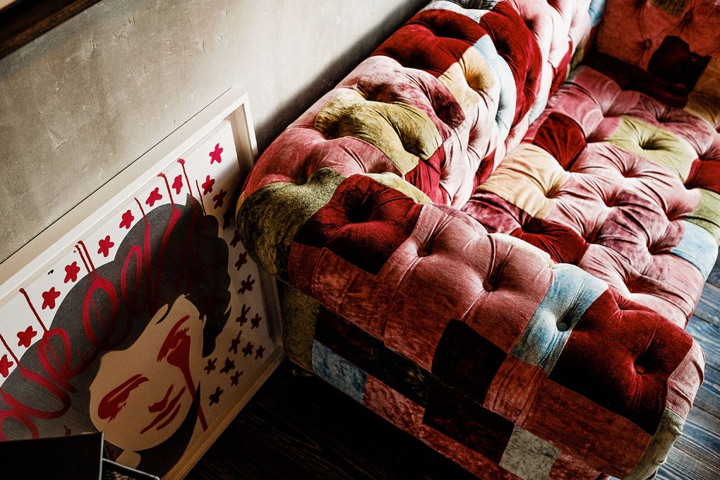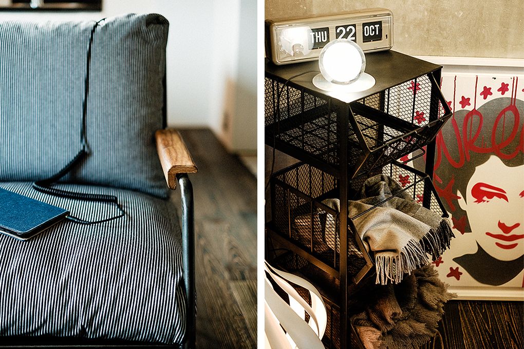 灰色のコンクリート壁、黒い鉄と白い照明。パンチのある色鮮やかかなソファ。