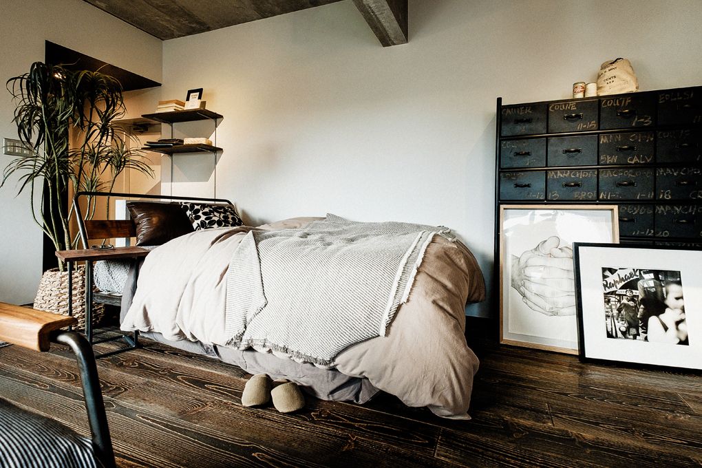 グレーベースのコンクリート壁、そしてダークブラウンの落ち着いたフロア。スポットライトの光さえ吸い込んでしまいそうな、マット感の強いワンルームです。アイテムは「それだけでも存在感のある」ような、スター達をかき集めました。