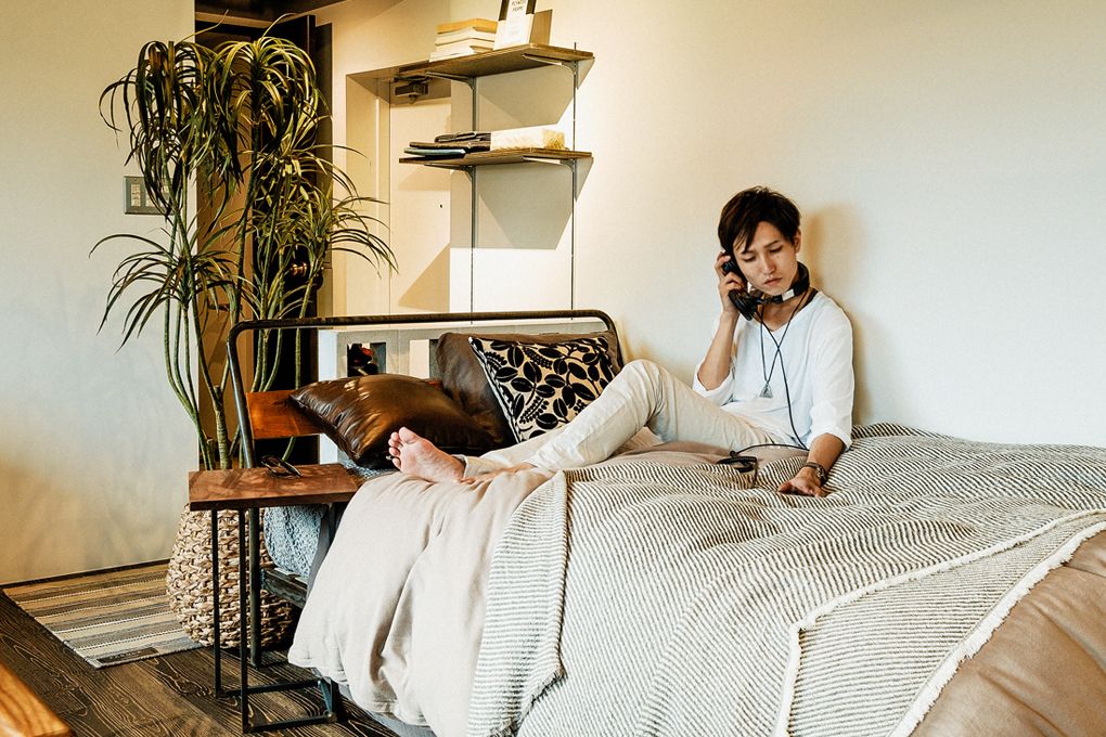 硬さの中にファブリックでギャップをつけます。色彩と素材感で"分かりやすい"メリハリをつけ、ワンルームという限られた空間の可能性を引き出します。