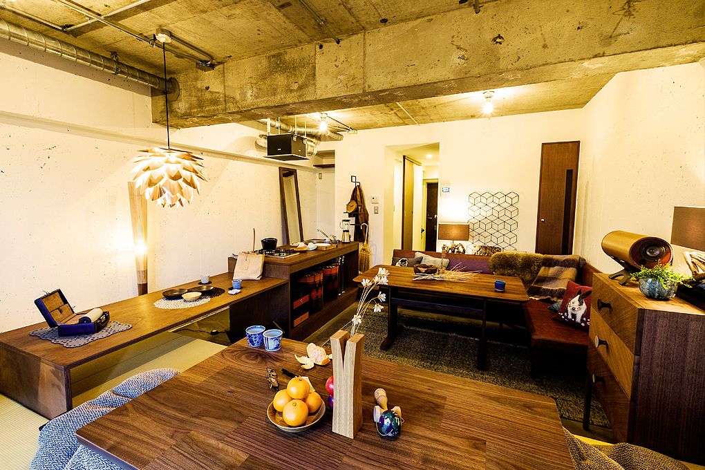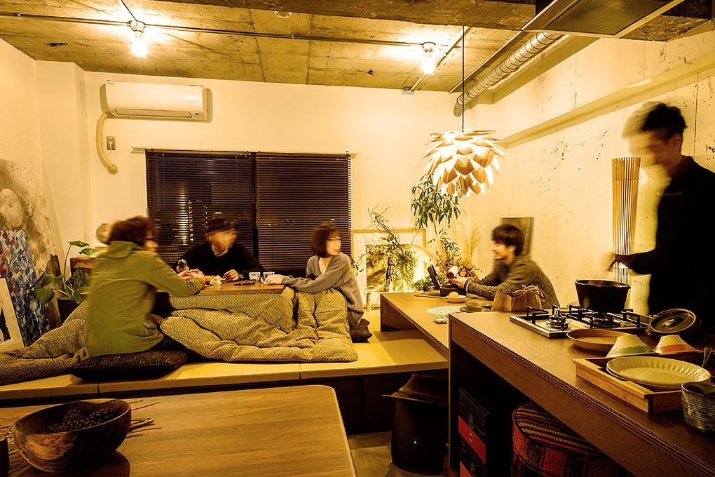 土間空間にはローダーニングセット。高さ関係もちょうどいい。小上がりには”コタツ”を。失礼、「洒落たコタツ」を。