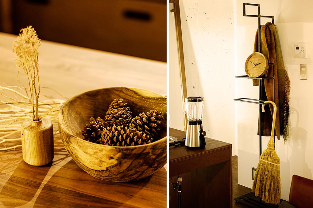 空間全体を見ても木は多いのですが、グッとパワーのある小物をさしてあげるだけで十分際立ちます。