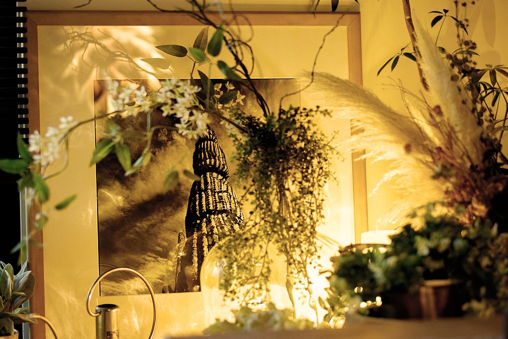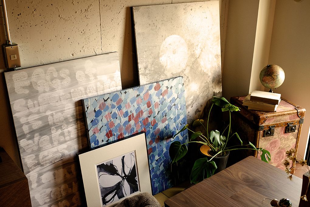 上記と同じように壁面にアートを立てかけ、植栽をランダムに配置して合わせました。