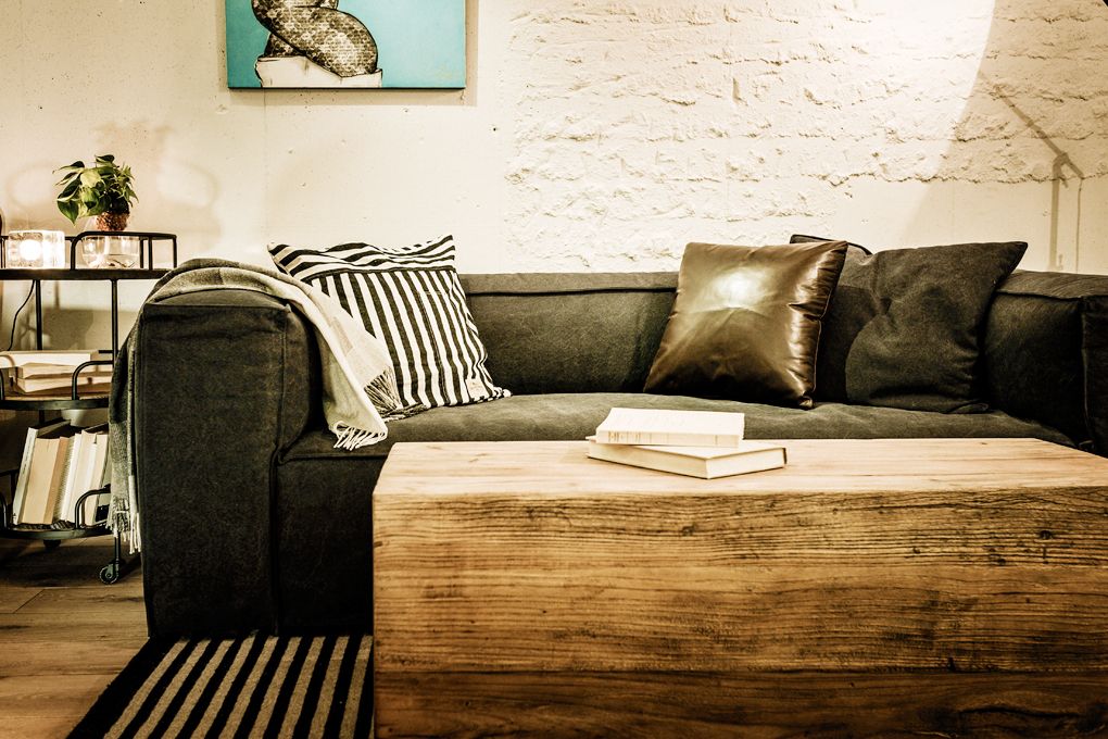 彩度の低いボリューム感のあるゴツッとしたアイテムで構成し、ラグ・クッションに使用したボーダーがモノなアクセントとなって動きを出してくれています。