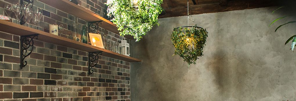 ボリューム感たっぷり、葉っぱシェードのペンダントランプが、ひときわ目をひくアクセントとして効いてます。