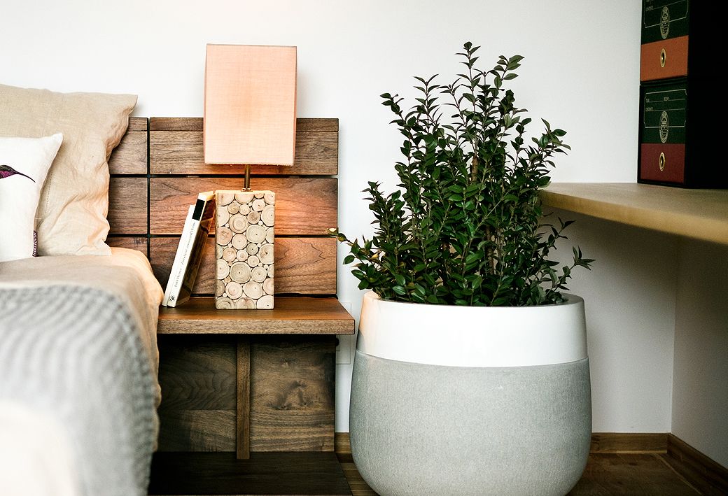 グリーンのアクセントと光の陰影、浮き上がる古材の質感。
