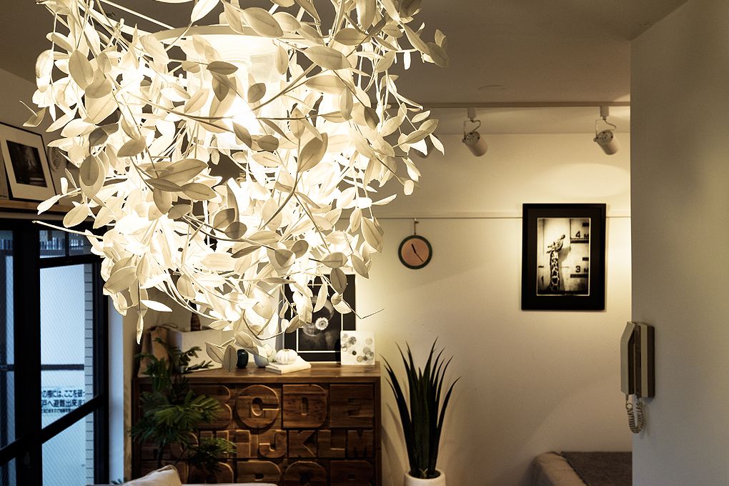 日常に遊び心と癒やしを。植物を模した照明の装飾は、「エアクリーンペーパー」によって造られています。