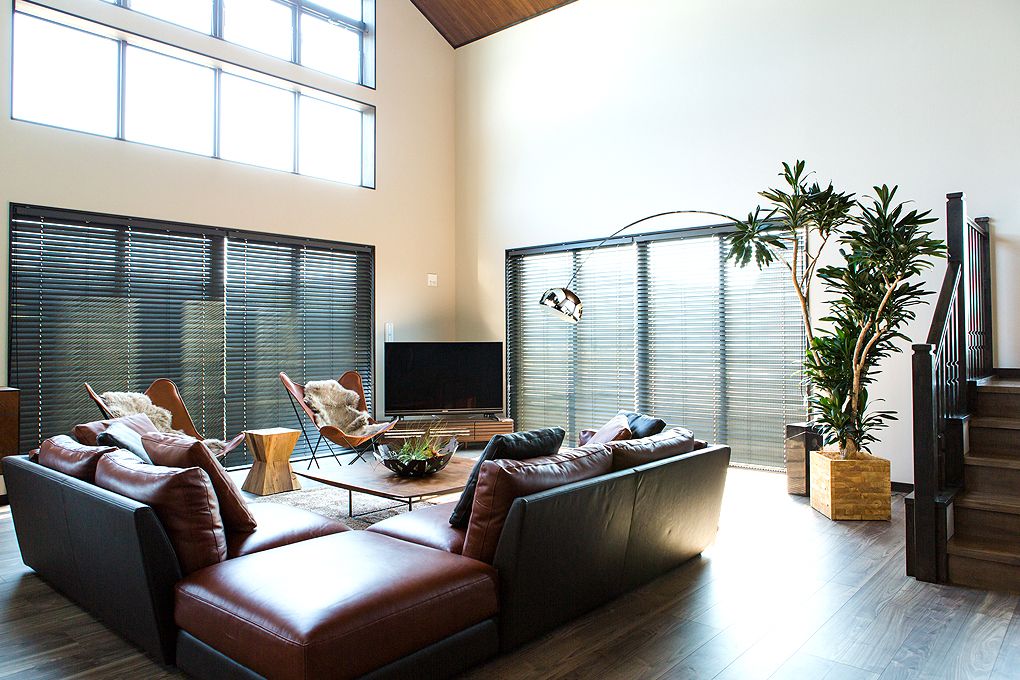 天井高7mの吹き抜け空間に負けないほどのボリュームをもつカルロスソファ。