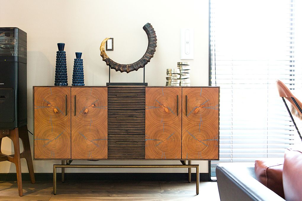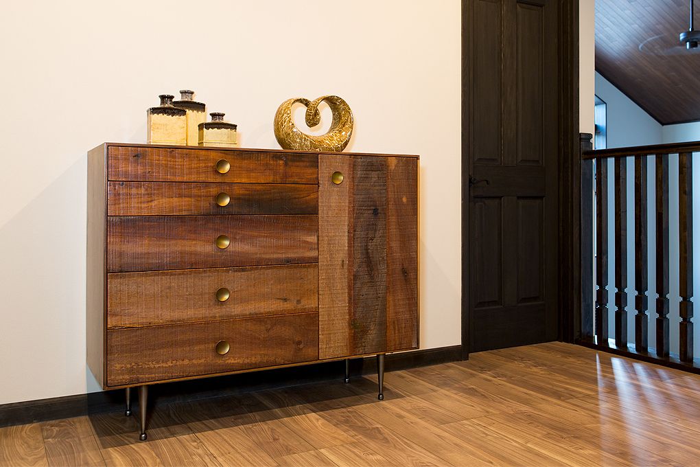 ウォールナット材と古材を抱き合わせ、真鍮の取手が煌めくジュリアン。
