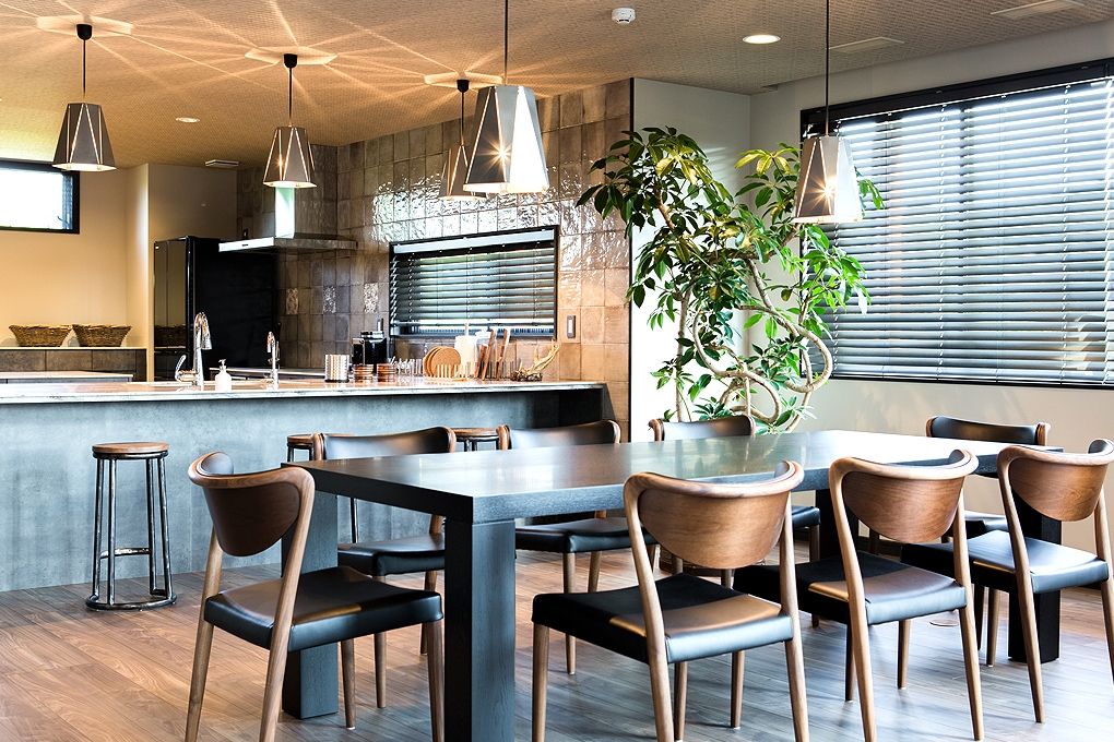 外は宵闇に包まれ辺りが眠りにつく頃、ライトアップされたインテリアが昼間とは異なる表情を見せます。