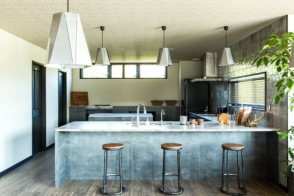 ダイニングより更に奥、天井の下がった空間はグレイッシュな石目をベースとしたキッチンカウンター。