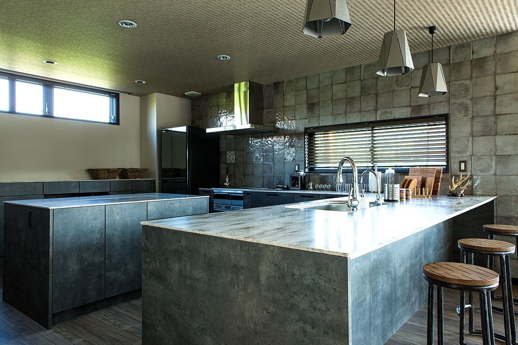 広々としたキッチンは、まるで石を切り出して造形したようなカタマリ感の強いテイスト。