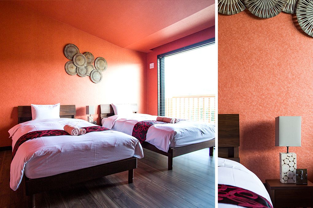 ダークブラウンのベッドフレームとディープレッドのベッドスローが良く映えます。