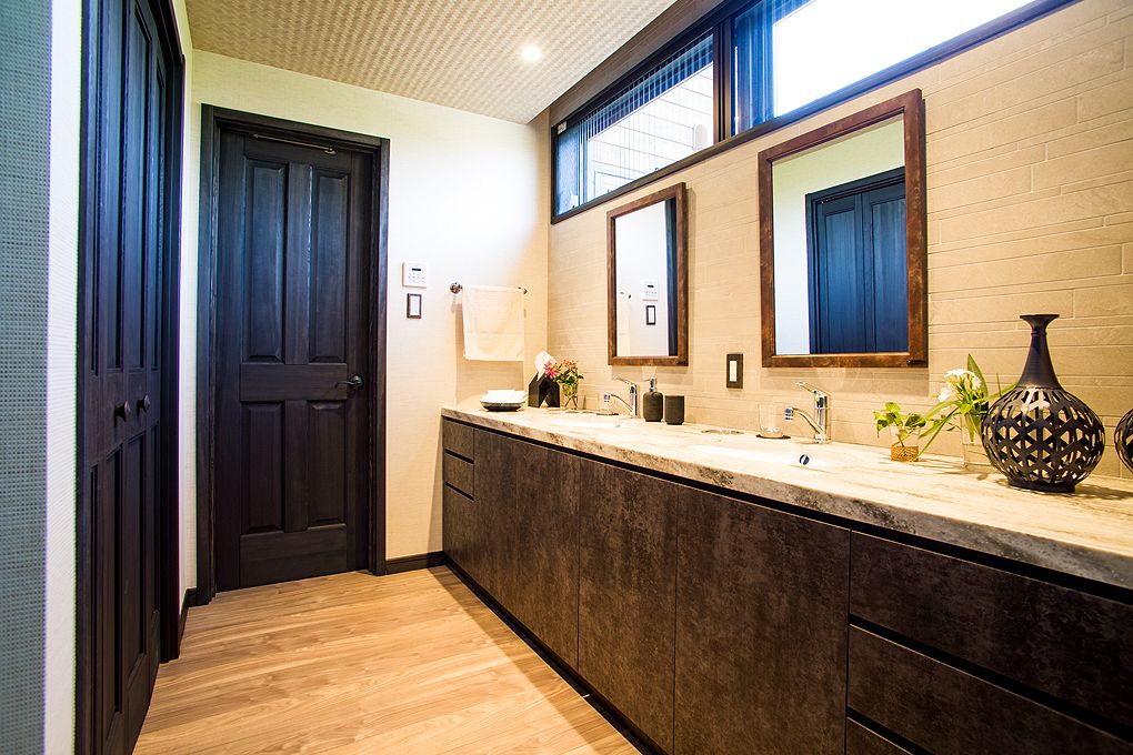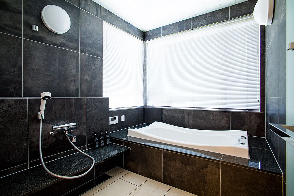 ダークカラーの石に包まれた開放感のあるバスルーム。