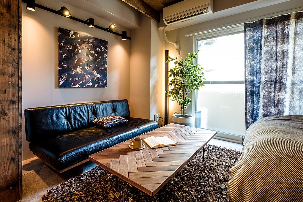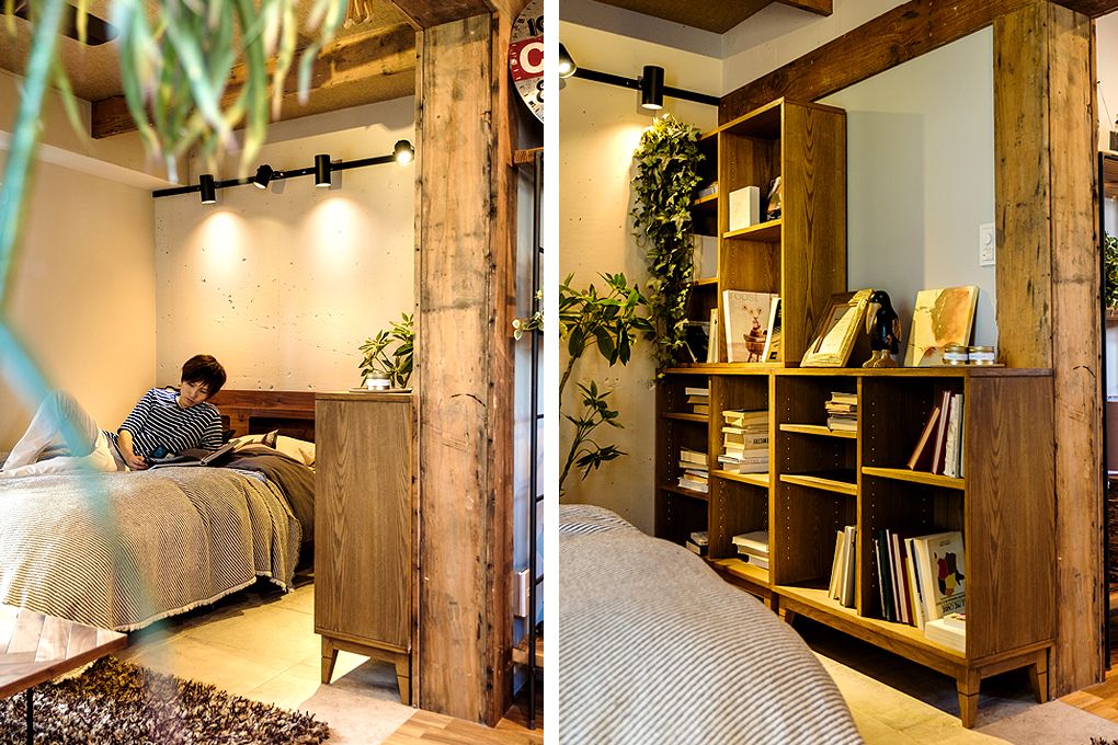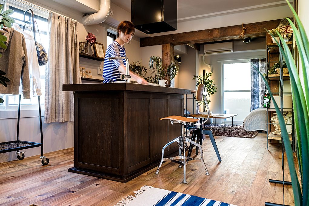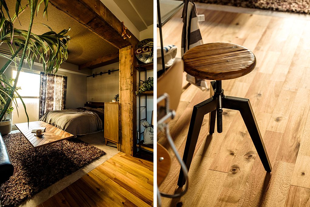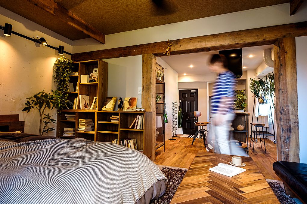 つづく第22弾、使い古されたヴィンテージテイストの木材がゾーニングを図る、温かみの中にあるタフな印象を覚えるワンルーム。