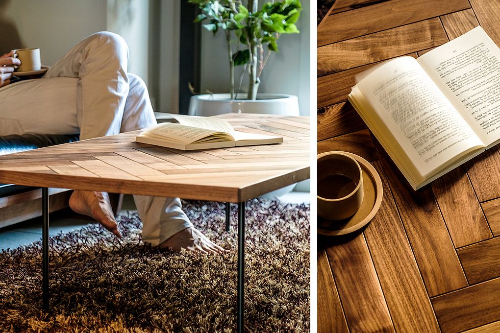 天板はウォールナット無垢材を使用。節や白太、色の濃淡など、様々な表情の材をヘリンボーンのパターンにつないでいます。脚部は無垢鉄。使い続けるほどに風合いの深まる素材だけでつくりました。年月を経て、傷やシミが増えていくとともに味がでてきます。