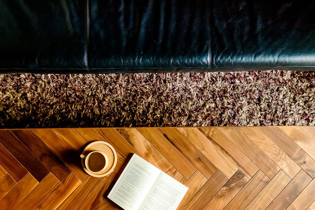 簡易的に文字にすればこれだけですが、レザーにシワがよっていたり、ラグの毛足が複数色のMIXだったり、綺麗な木目のウォールナットがヘリンボーンとして貼られていたり。