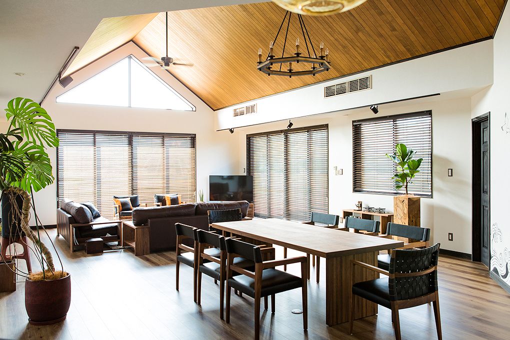 三角屋根が印象的な、平屋スタイルのリゾートコテージへと仕上がりました。