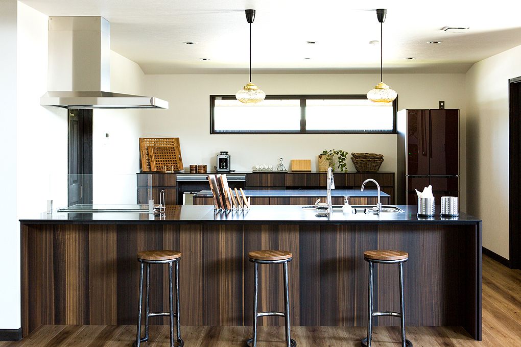 黒い石材カウンターに縁取られた、くっきりと印象的な木目が特徴のキッチンカウンター。