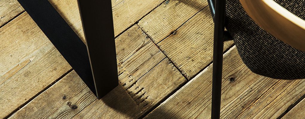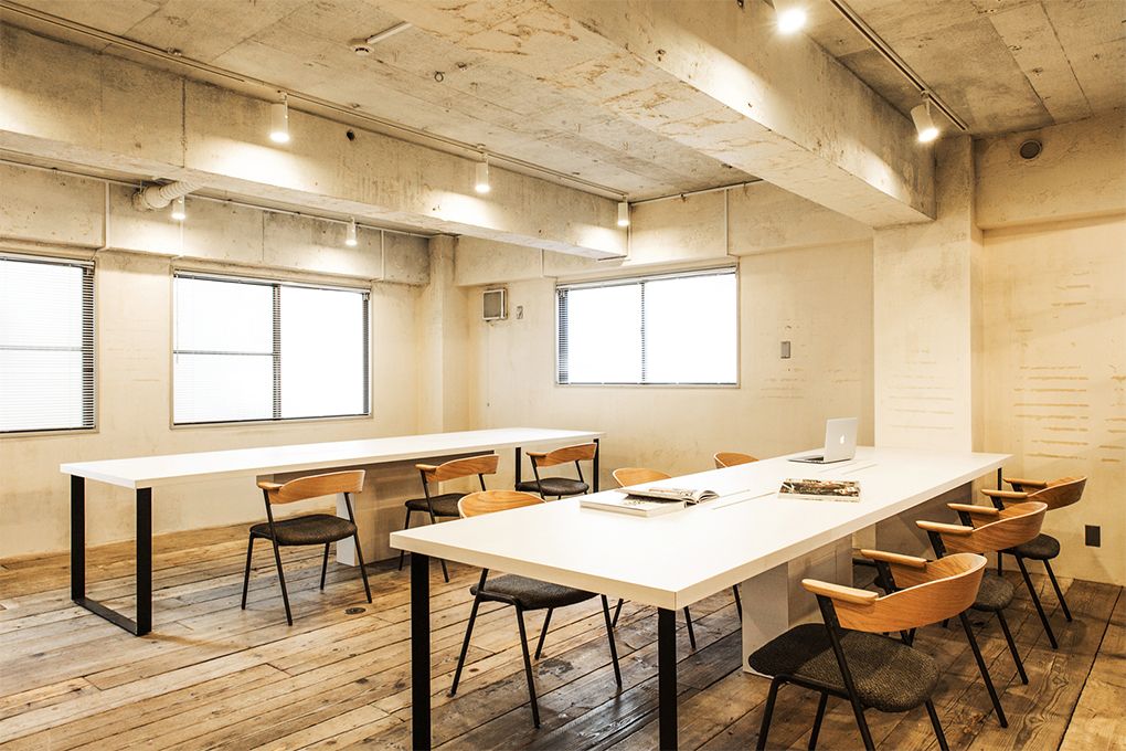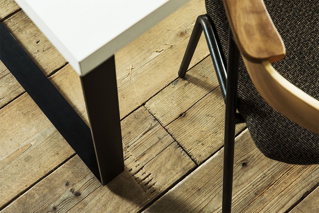 黒いスチール脚は床と、天板は壁・天井とそれぞれ混じり合っています。