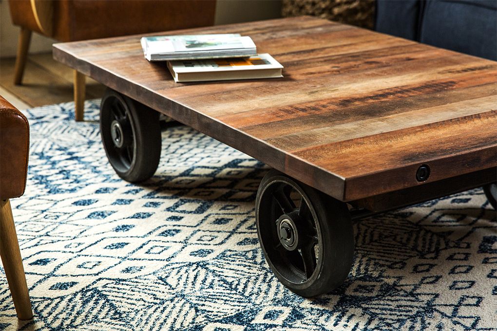 タイヤとラフな古材天板が印象的なカートコーヒーテーブル。