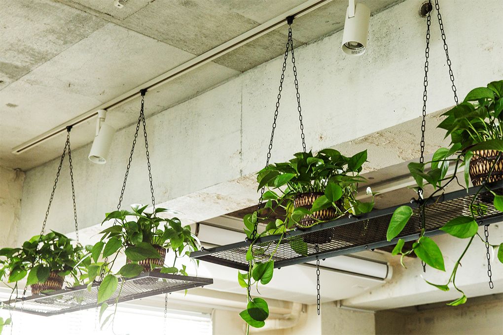 その上にはライティングレールから棚板を吊り、目線より高い位置に植栽を配置。