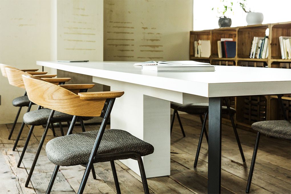 スチールや古材でラフさとの調和を図り、チェアやソファはファブリックでやさしく整えます。