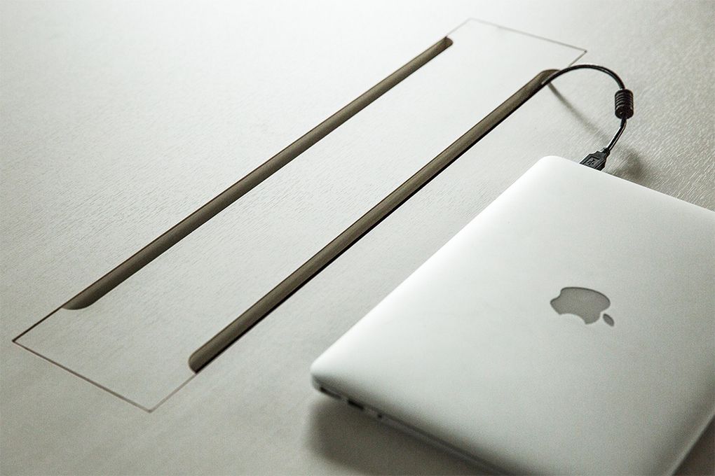 さらに内部でコンセントタップを設置し、天板からパソコンや携帯充電器などのコードが出せる仕組み。