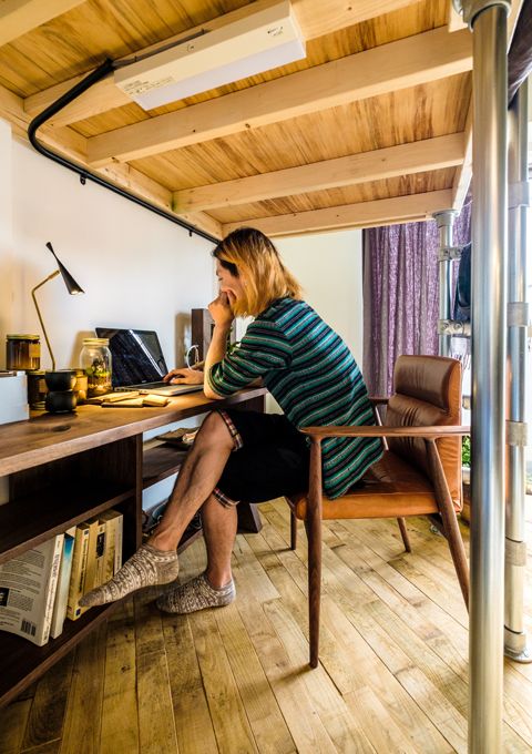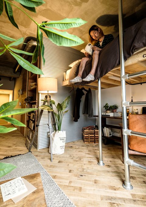 スチールパイプで組まれた梯子を登りロフト上へ。足はブラーンと投げ出して、何やら読書に勤しんでいるご様子。これ、大人になっても楽しいやつです。間違いない。