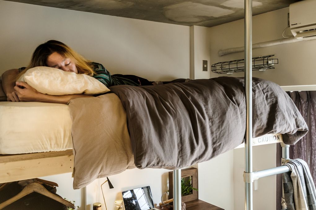 ロフトの上にはマットレスをそのままドンと置いて即席ベッドに。