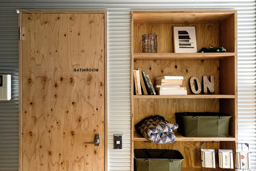 波型に凸凹したトタン壁。木の箱や建具を埋め込んだ、インダストリアルな小屋を思わせます。