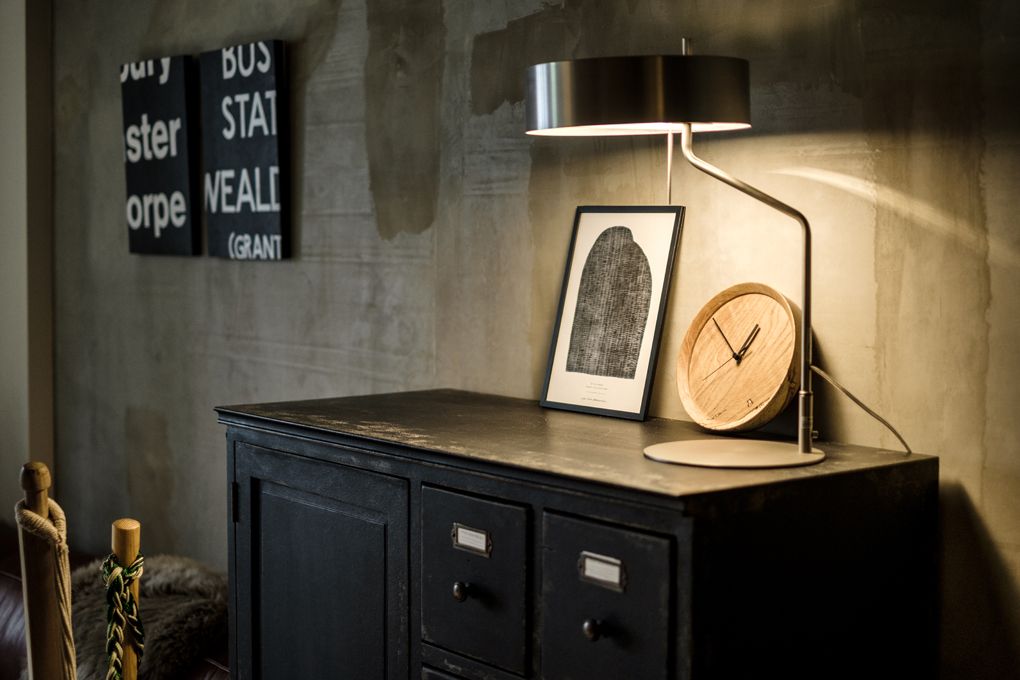 日が傾き始め、部屋の間接照明をONに。日中の外光とは異なる人工的な光が、部屋の素材感をさらに強く濃く浮かび上がらせます。