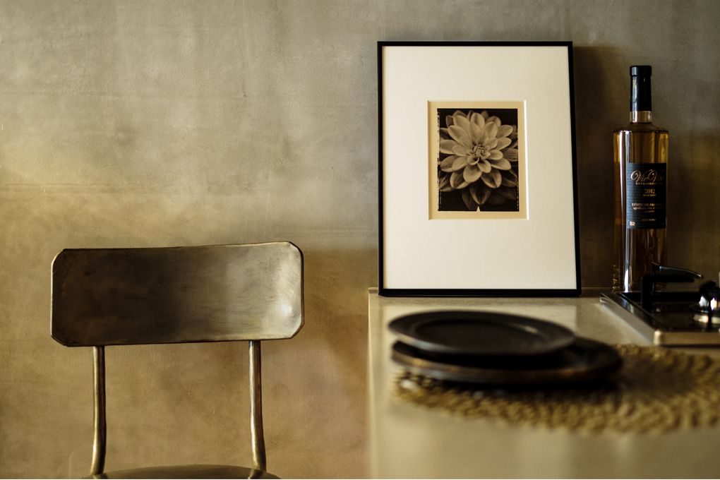 ユーズドスチールの無骨なハイチェアと、いつかの花を写したアートフレーム。