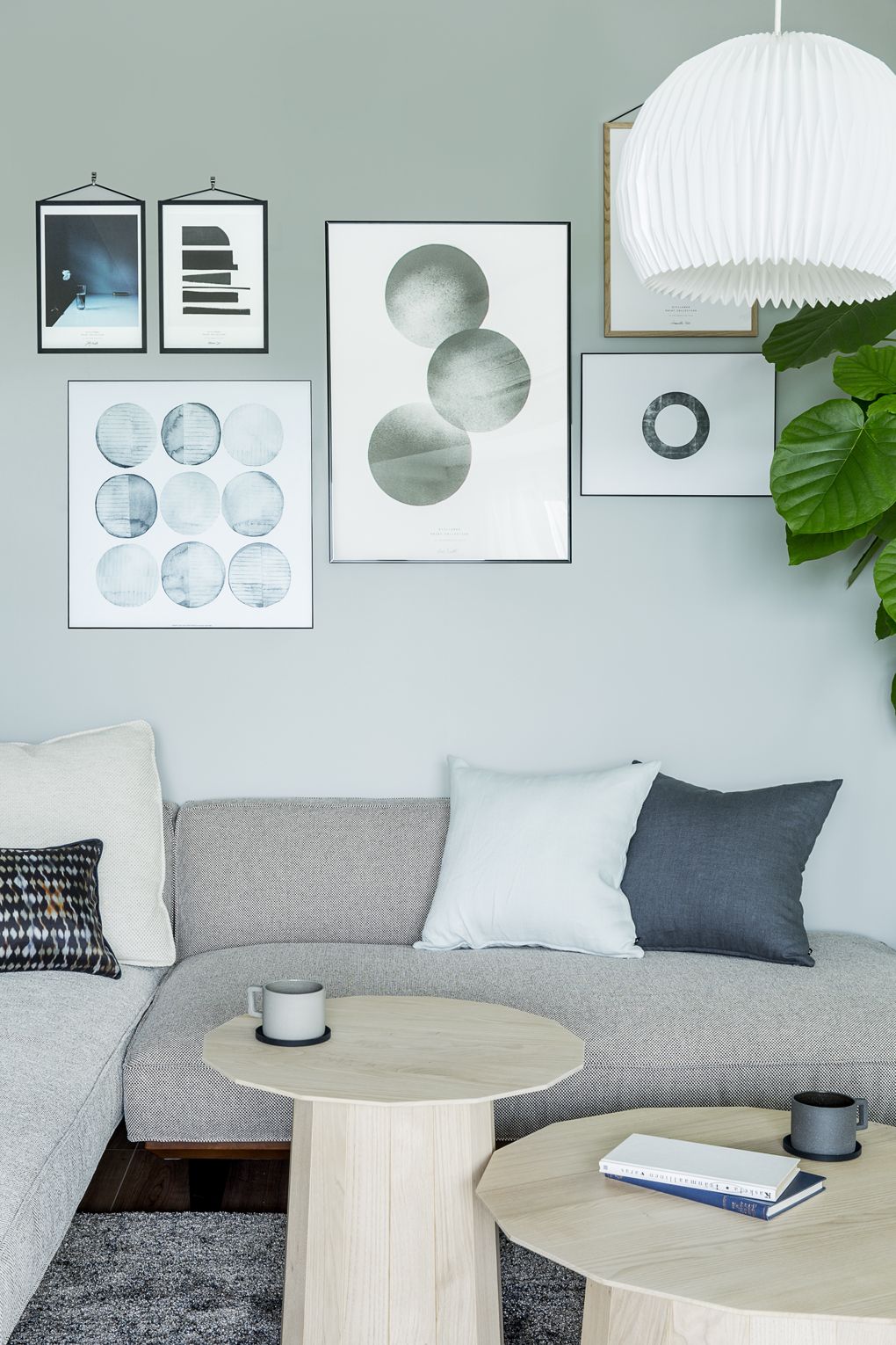 淡いブルーの壁面には、モノトーンでまとめたアートを無造作に並べて、カジュアル過ぎないように。