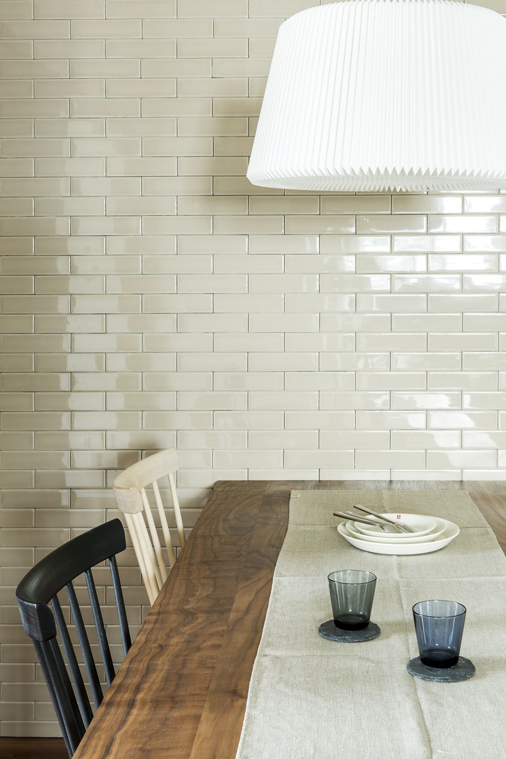 簡素なのにエレガントなペンダントはこれも北欧生まれのLE KLINT(レ・クリント)「120 XL」。グレージュの2丁掛けタイルに浮かぶ白が美しい。