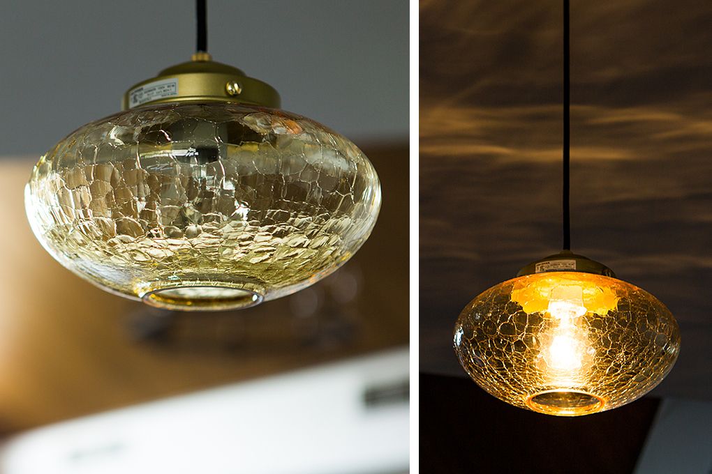 ガラスシェードにヒビ加工が施された、どこかノスタルジーなペンダントライト。