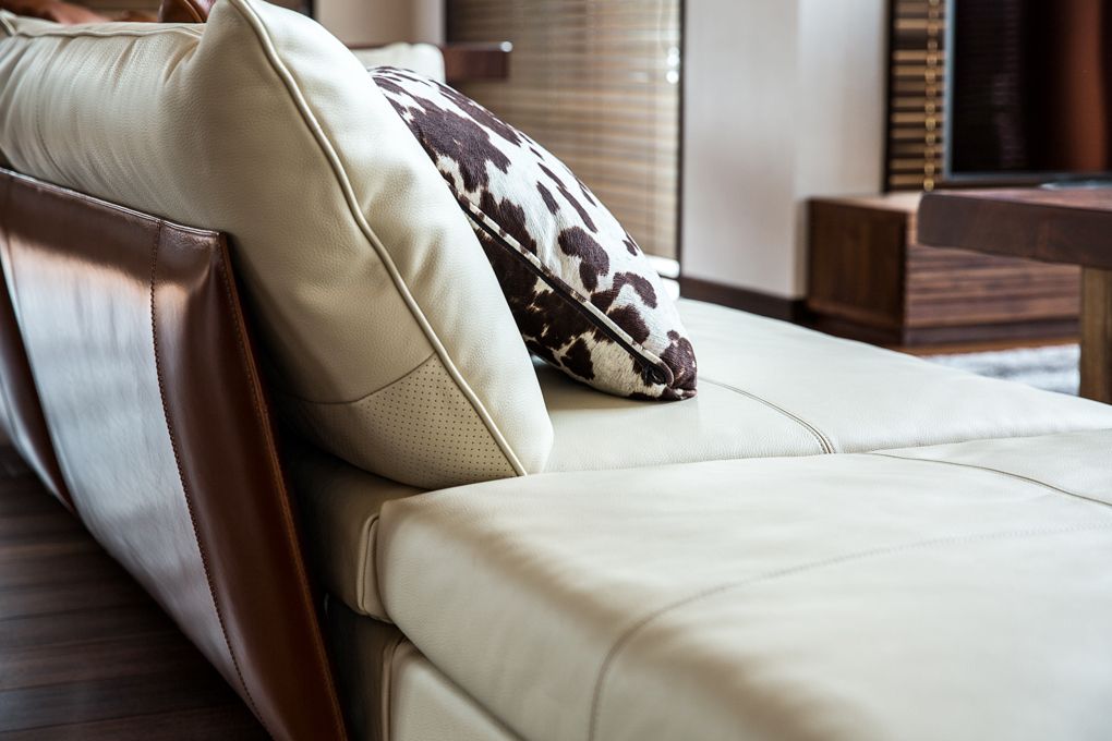 フルレザー仕様のモデュールソファを組み合わせ、L型として設置。