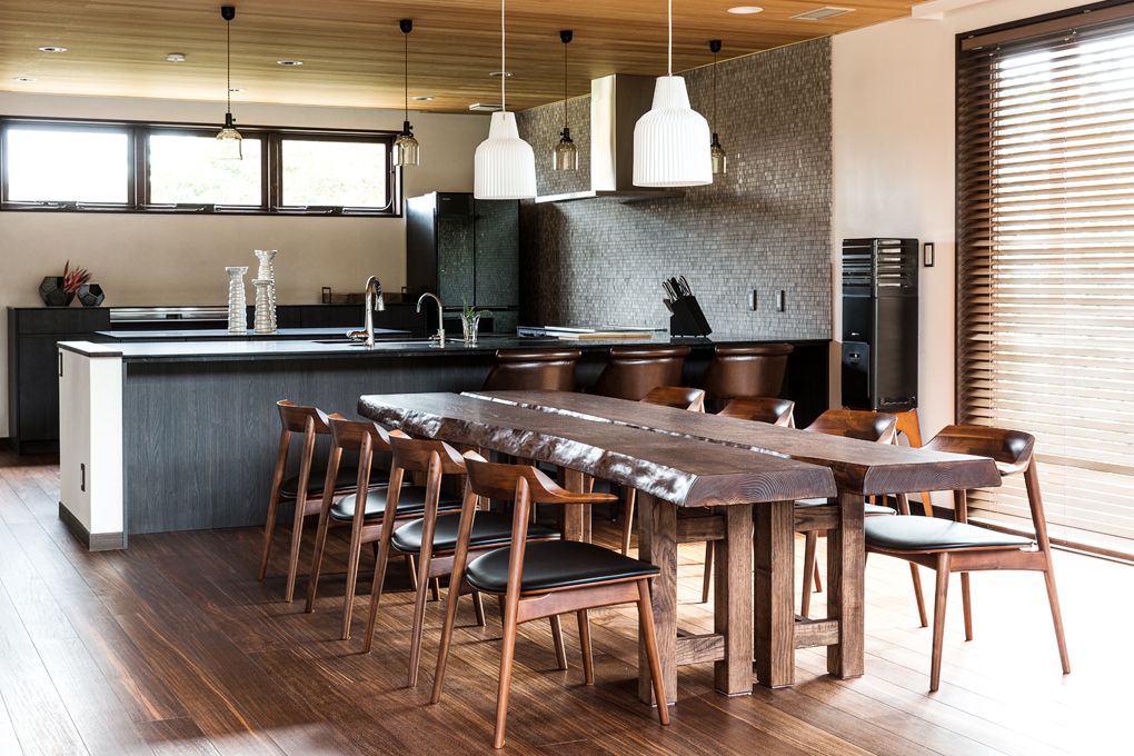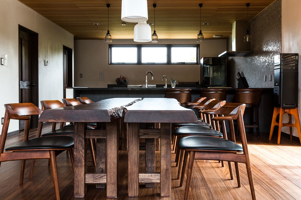 1枚板を2枚並列して設置された、趣のあるダイニングテーブル。