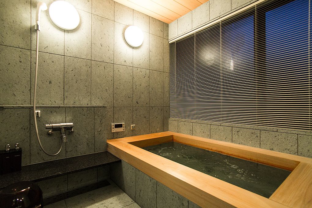 石とヒノキを使った贅沢な浴室。ジャグジーで芯まで温まった体を冷酒で冷ましたいものです。