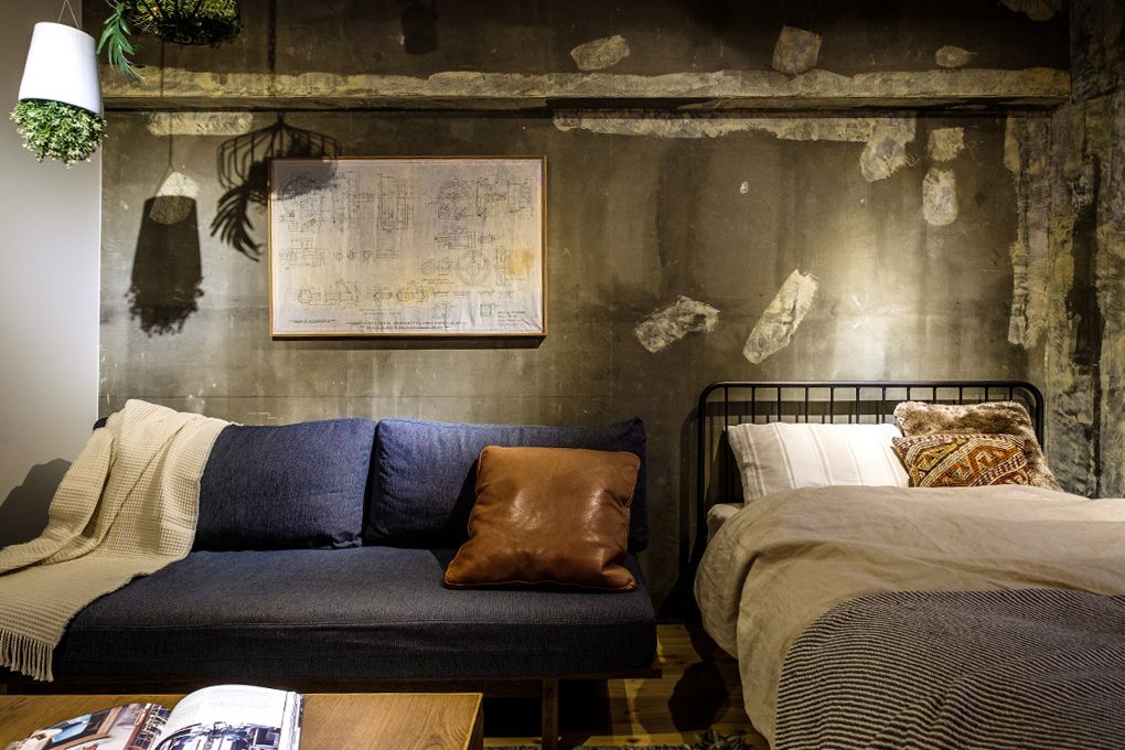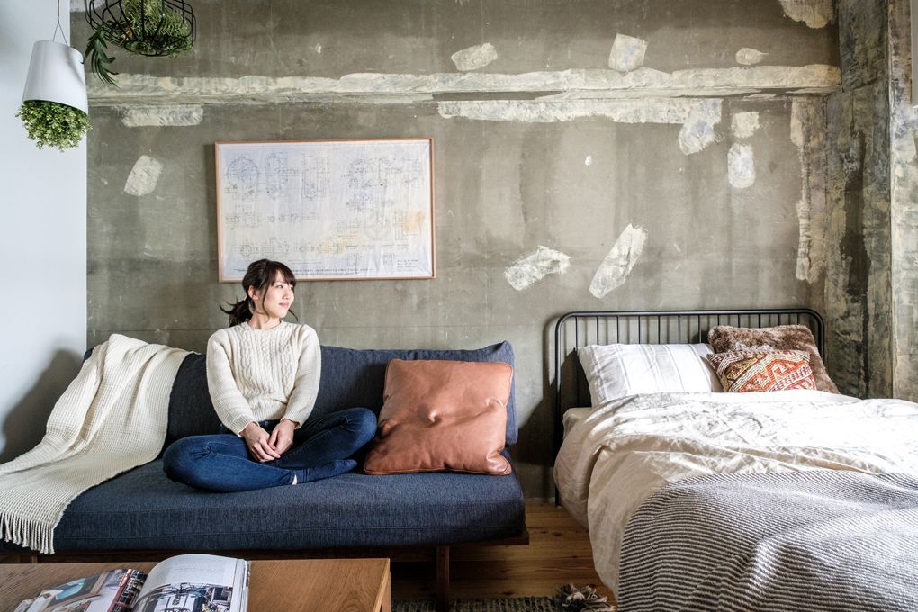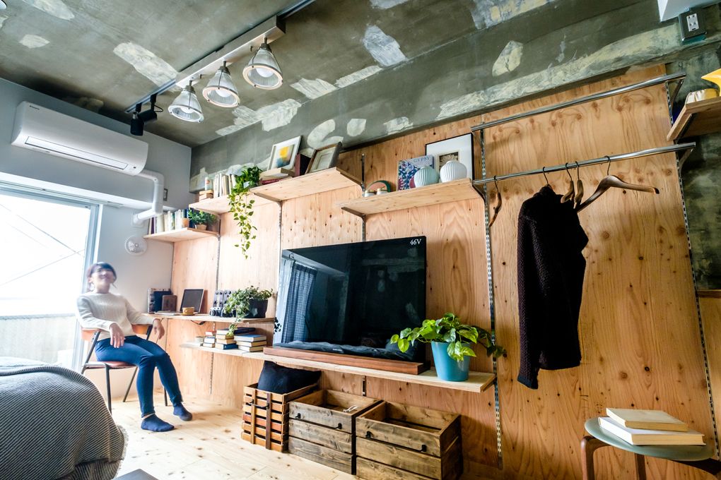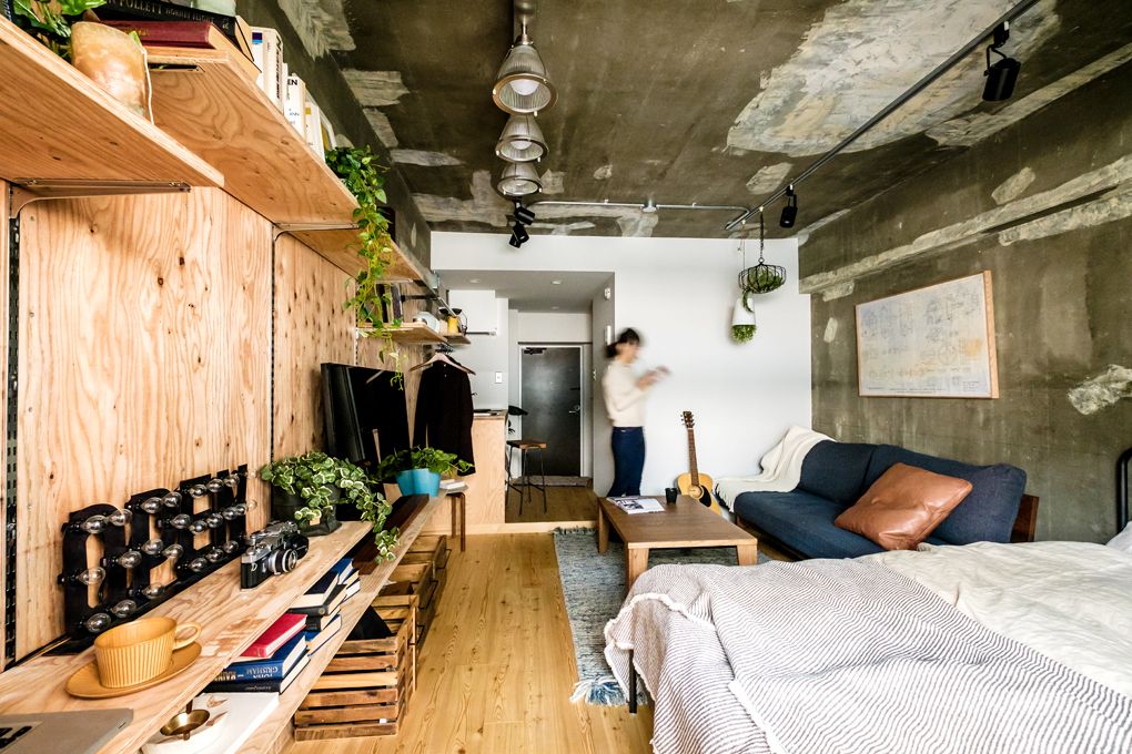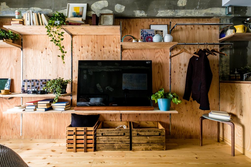 つづく第25弾、ウッドとモルタルで構成されたワンルームには、モルタル面にパテ痕をわざと残していたり、対面には一面に可動棚を設けたフレキシブルなアイデアウォール。それはまるでモルタルに縁取られた大きなアートフレームのよう。