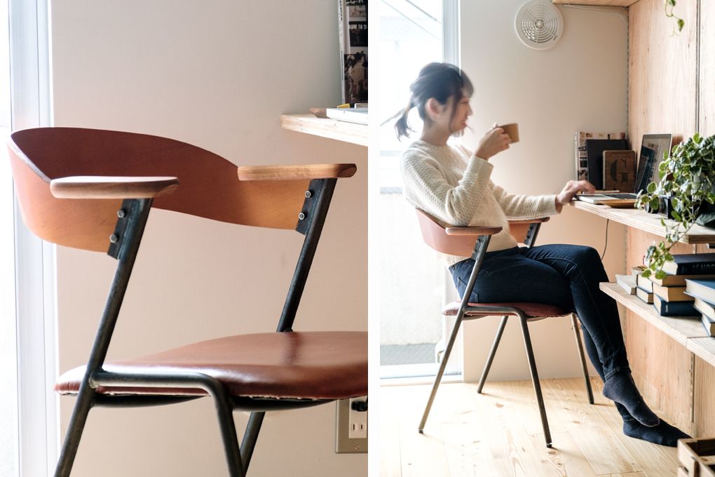 座面にはオイルレザーを張り込み、ファブリック張りのチェアより少しだけ重厚感あり。