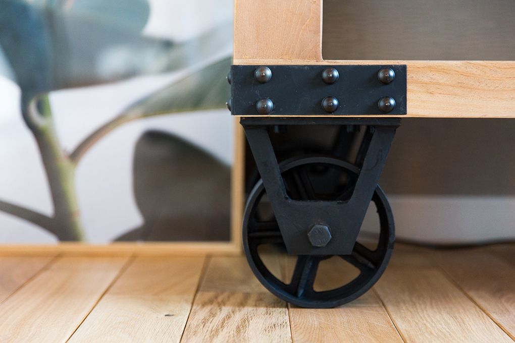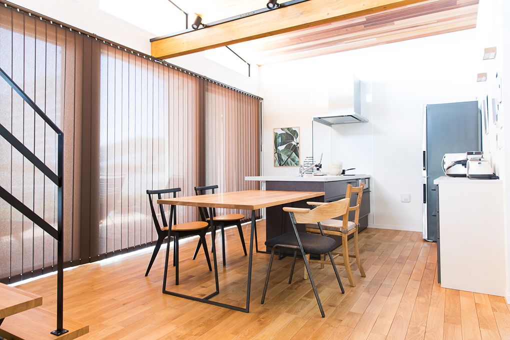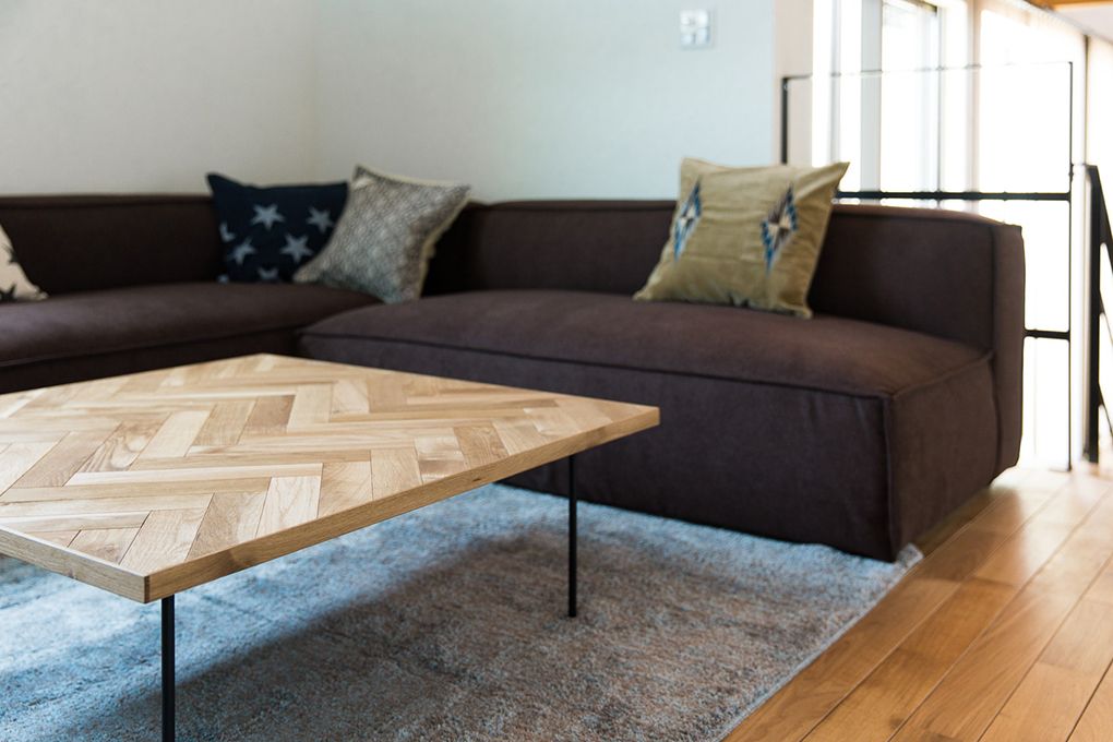 家具もインテリアのマテリアルと合わせ、スチールとオーク、古材を取り入れたライトなインダストリアルテイスト。