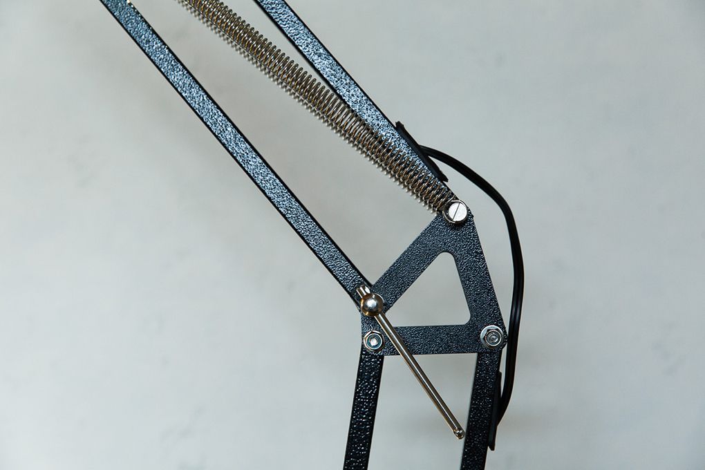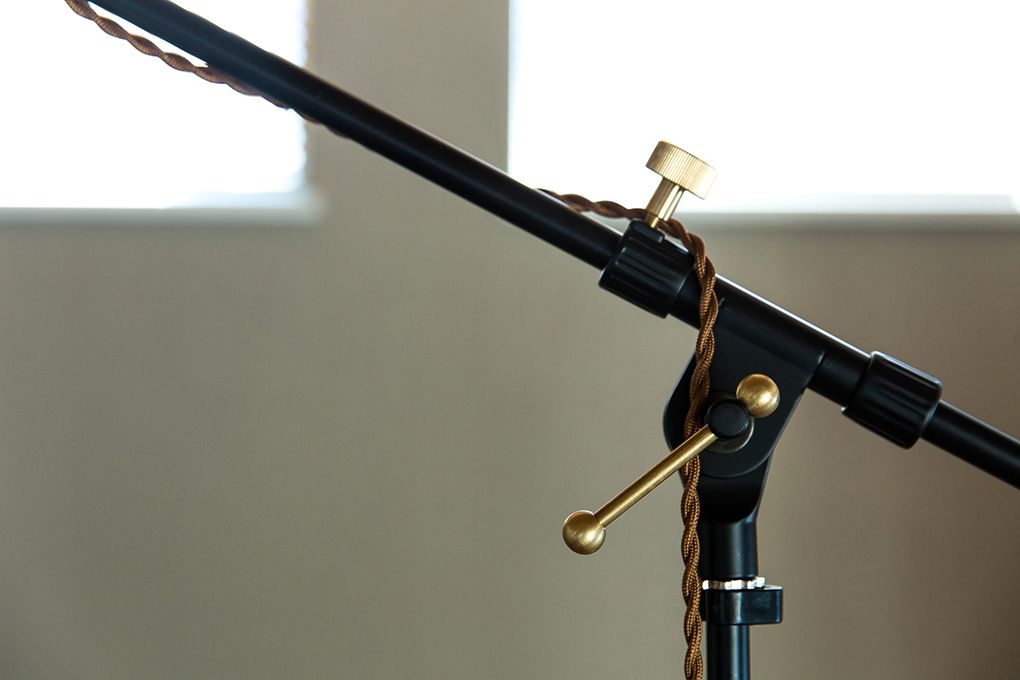 長く伸びるブラックアーム、巻きつくねじれコード、真鍮のネジ。