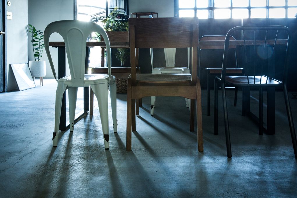 ライトなダイニングにはかわいいフォルムのハードなチェア。