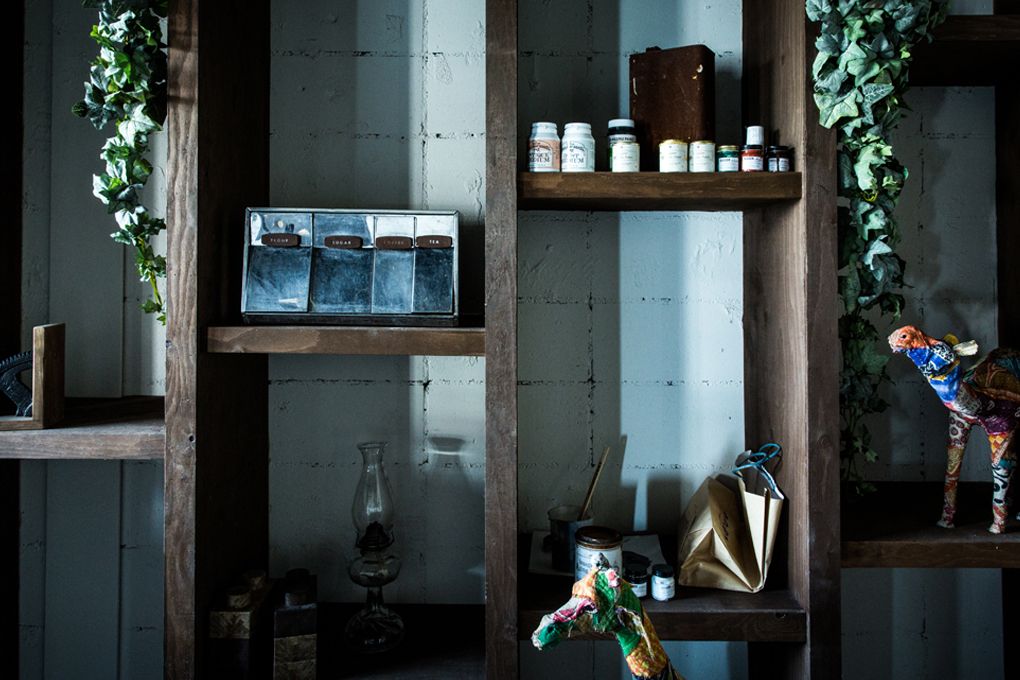 1階はモルタル床にアンティークテイストのカフェスタイルを。窓際には小さな手芸工房が。道ゆく人たちに向けて、穏やかな日々を語りかけます。