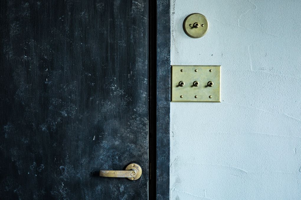 ゴールドのトグルスイッチ、黒のエイジングを施した扉。