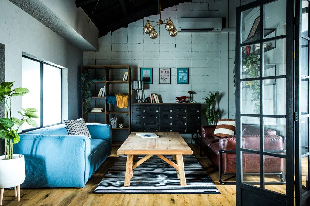 黒が空間をの輪郭を引き締め、キャンバスとレザーのソファがいいコントラスト。